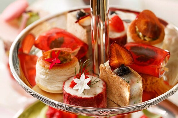 セイボリーには、キャビアが添えられた帆立といちごのクリスピーなサンドイッチや、いちごのジュレで包まれたフォアグラのムース、いちごのコンポートと組み合わせたチキンガランティーヌなど、いちごの魅力を最大限に引き出した品々が揃う。