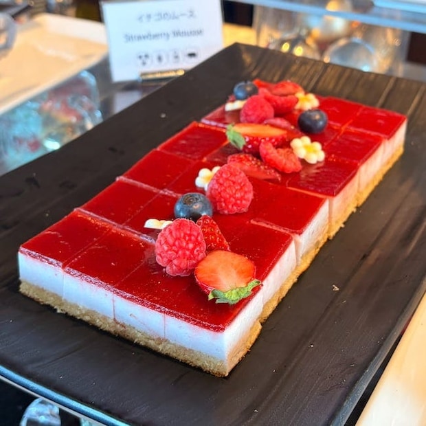 さまざまなケーキのなかでも編集部が気に入ったのは「いちごのムース」です。薄いスポンジの上に甘酸っぱいムース、ツヤツヤの真っ赤なグラサージュがかかっていてかわいい。しっかりといちごの酸味が感じられるので、たっぷりと甘いスイーツをいただいた後や合間にいただくのがおすすめです。ほかにもバウムクーヘンやパンナコッタなど舌はもちろん、目も満足させてくれるスイーツが並ぶので、セルフのコーヒーや紅茶とともに思う存分楽しんで。