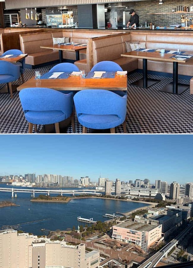 ランチ&デザートビュッフェの会場となる「The Grill on 30th」は、深いブラウンを基調にブルーチェアを配置した落ち着きと洗練さを感じる空間。大きな窓からはオーシャンビューが楽しめ、席によってはレインボーブリッジや東京タワー、スカイツリーが臨めます。美しい景色とともにいただく充実のランチは、普段のデートだけでなくお祝いなどにもぴったりの雰囲気。