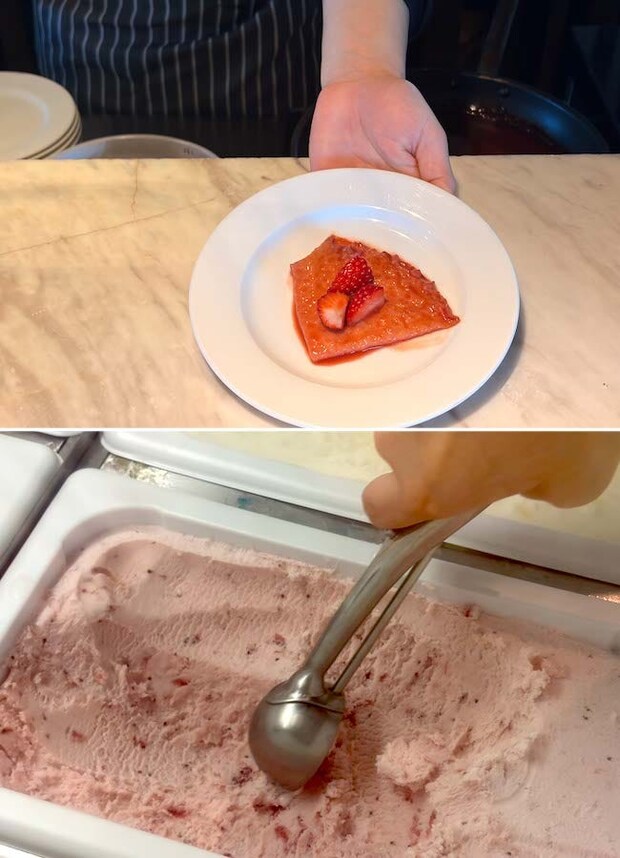 シェフが目の前で仕上げてくれるシェフサービスでは、「いちごのクレープシュゼット」を提供しています。焼き上げたもちもち生地を甘酸っぱいいちごソースで煮詰めた逸品で、このままアツアツをいただいてもおいしい。