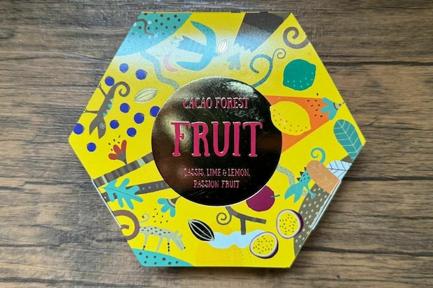 黄色を基調にした華やかなパッケージが目を引く「カカオの森 フルーツ」です。