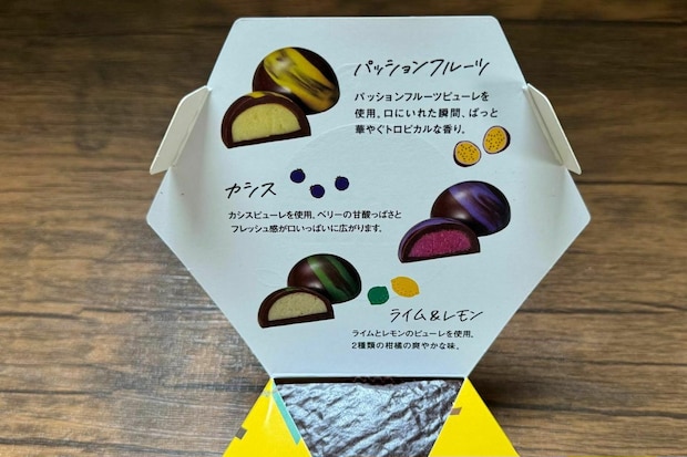 ライム&レモン、パッションフルーツ、そしてカシスのチョコレートを詰め合わせており、フルーティーなチョコレートを楽しめる一品です。