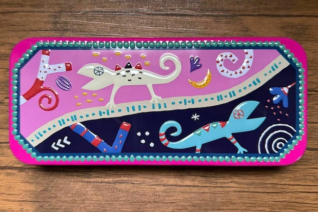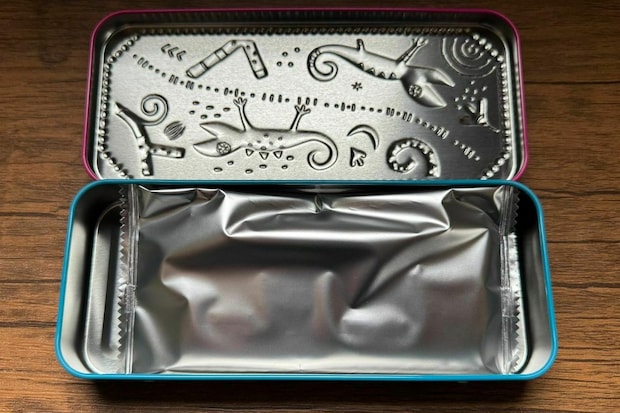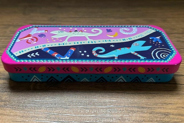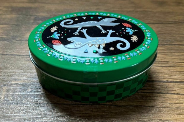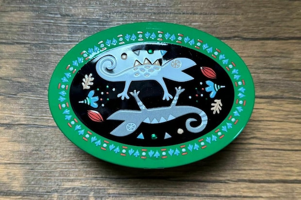先に紹介した、板チョコトカゲ缶よりも、少し小ぶりなメタリックなカラーがかわいいオーバル型の缶です。