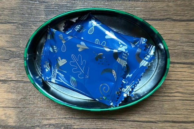 缶を開けてみると、青いパッケージで包装されたチョコレートが4枚入っていました。
