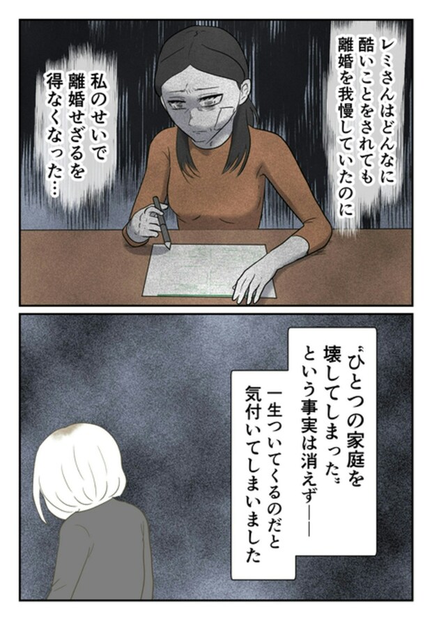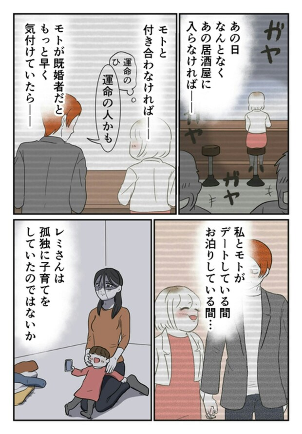 騒動ののち、モトの妻・レミから電話がかかってきます。夫婦関係が破綻していた2人でしたが、レミは心からモトを愛していました。モラハラやDVを受けても耐えていましたが、不倫騒動がきっかけで離婚せざるを得ない状況に。