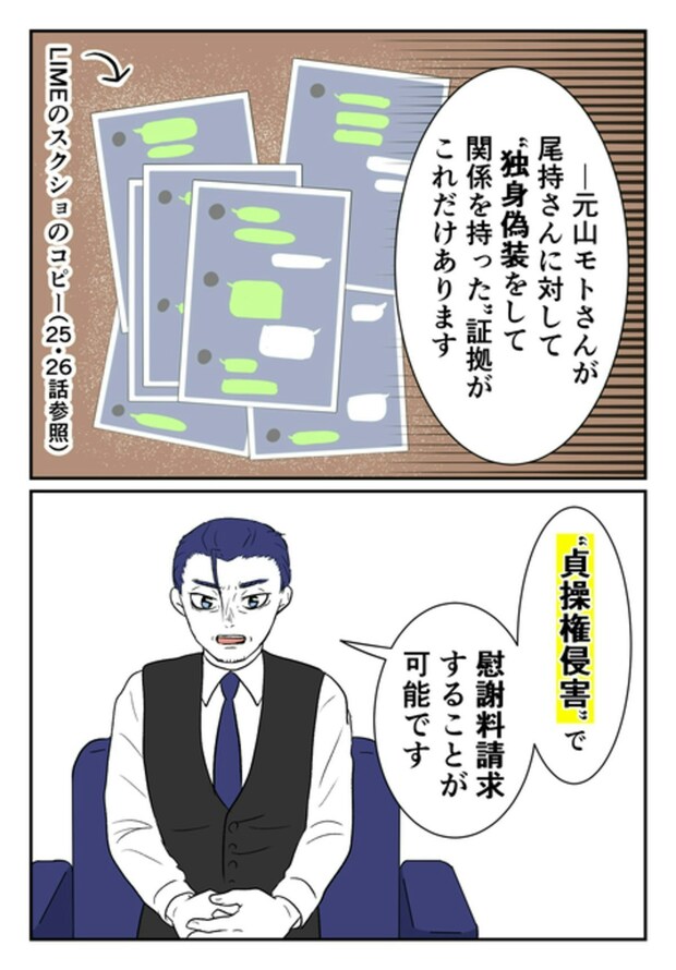 「不倫女」のレッテルを貼られ、慰謝料を請求されてしまった尾持さん。ですが、尾持さんはモトが妻子持ちであるとは知りませんでした。だまされた証拠を集め、弁護士に相談し、慰謝料を支払わずに済みました。