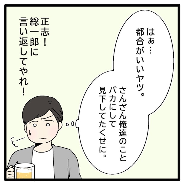 総一郎さんが地主の長男で、同級生たちのリーダー的存在だったのに対して、正志と裕二さんはクラスの端っこにいるような目立たないタイプ。学生時代は正志たちのことを散々見下していたのに、有名企業に就職したと分かった途端、総一郎さんは正志のことを「聡子の結婚相手にふさわしいのは正志だった」と都合よく持ち上げました。
