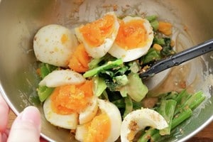 1. まずはゆで卵を作り、殻をむいて食べやすく切っておきましょう。今回は卵の存在感を出したかったので、大きめに切りました。