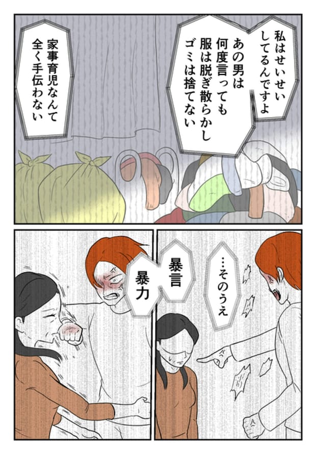 モトさんとの「離婚」が決まったという妻…。育児家事を手伝わず、暴言や暴力をくり返すモトさんと離婚することを、「せいせいする」と言います。これまで、いろいろな思いを抱えていたのでしょう…。
