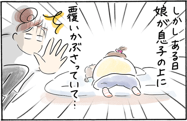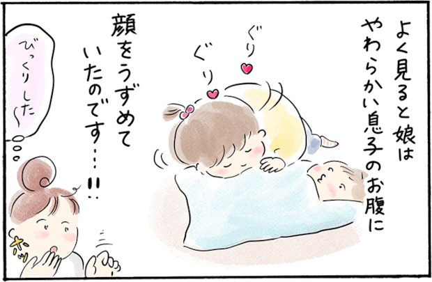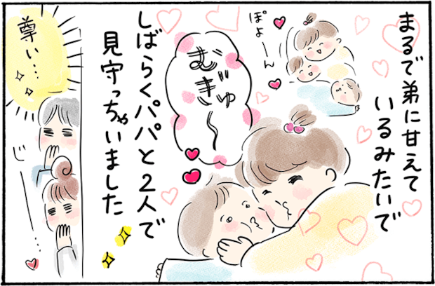 もともと甘えん坊だったという4歳の娘ちゃん。下の子が生まれた後、心配した赤ちゃん返りや嫉妬もなく、弟をかわいがってくれたそうです。一瞬ヒヤリとしたシーンもあったようですが、それはママさんの勘違い。実際はこの上なく愛おしい姉弟の姿がそこにあったのだとか。 この瞬間を見逃すまいと声を殺して見守るママとパパの様子に共感できますね。弟に甘えるような仕草のお姉ちゃんが微笑ましく、ほっこりかわいい体験談です。