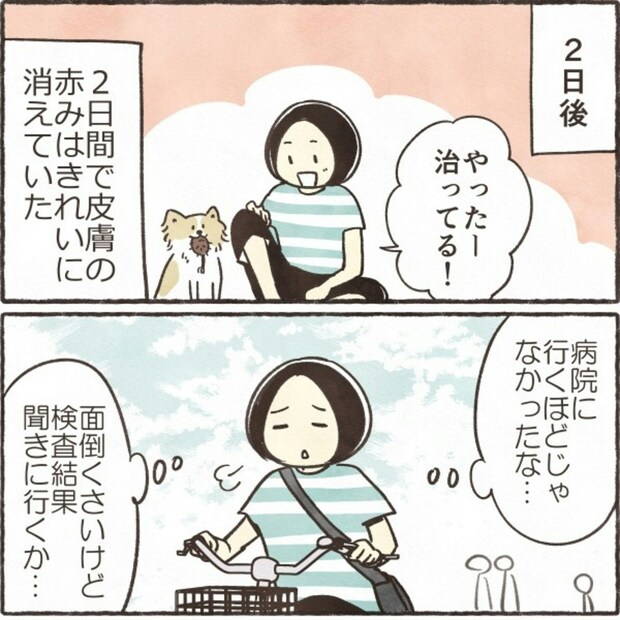 2日後には、ふくらはぎの赤みはすっかりきれいに消えていました。安心したきなこさんは少し面倒に感じながらも、検査結果を聞きに病院へ向かいました。