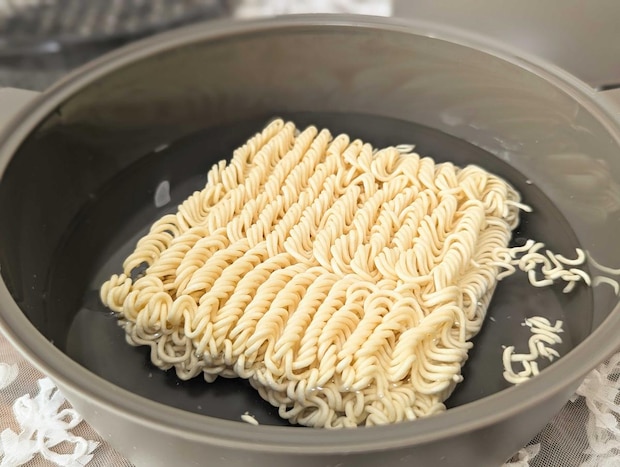 まずは基本の即席ラーメン。作り方は驚くほど簡単です。 本体に水(またはお湯)と麺を入れ、その上にザルをセットして野菜やお肉を乗せます。 こうすることで、麺を茹でながら蒸気で具材も一気に調理できちゃうんです!