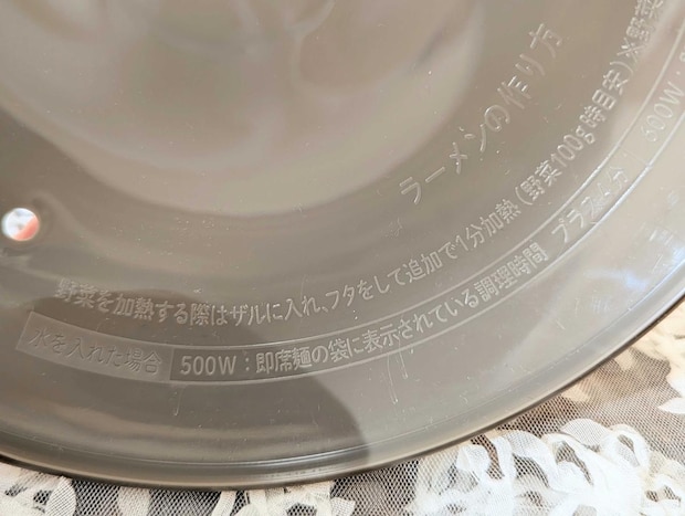 水から作る場合は「袋の表示時間+4分」、お湯からなら「+30秒」が加熱の目安(500W時)。 ザルに野菜を入れる場合は、そこからさらに1分追加すればOKです。細かい分数はフタの裏に書いてあるので、覚える必要もありません♪