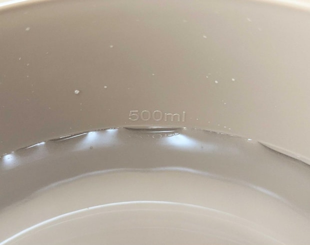 蓋の裏には加熱時間の目安が記載されているので、いちいち説明書を確認する必要もありません。 鍋の内側には500mlの目盛りが付いており、計量カップすら不要。かゆいところに手が届く、ありがたい設計です!