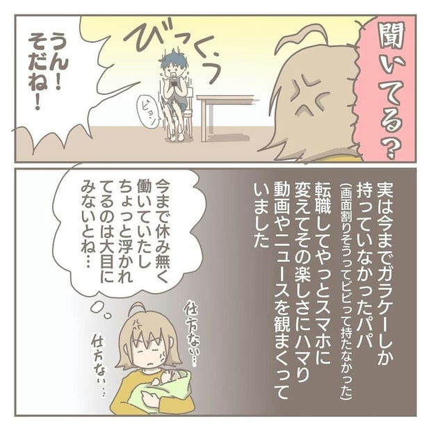 子育てを一緒にできることに期待を膨らませるヨカさん。しかし、夫はようやく手にしたスマホに夢中になってしまっているようです…。