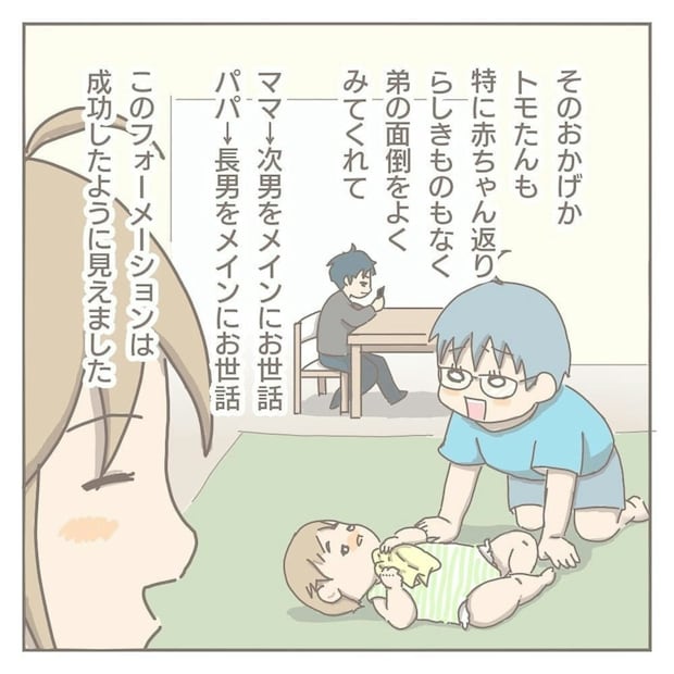 夫は積極的にトモたんのお世話にしてくれていました。そのおかげで、赤ちゃん返りもせずしっかり弟であるナオたんのお世話をしてくれたトモたん。とても順調です。