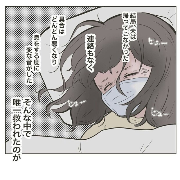 時間を追うごとに悪化していくフォロワーさんの体調が心配です。よっぽど根詰めていたのでしょう。夫は結局帰ってきてくれなかったといいます。そんな中、フォロワーさんの実母が助けにきてくれました。きっと、とてもホッとしたでしょうね。