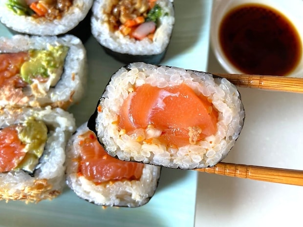 サーモンポキロールは、サーモンにピリ辛の味付けがすでにされているので醤油なしでもそのまま美味しく食べることができます。