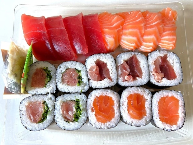 サーモン巻きが3つ、鉄火巻きが3つ、ねぎとろ巻きが4つ入って、握りもあわせて1パックに計18貫入り。