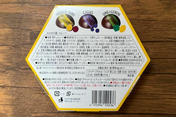 黄色を基調にした華やかなパッケージが目を引く「カカオの森 フルーツ」は、ライム&レモン、パッションフルーツ、カシスのフルーティーなチョコレートを楽しめる一品です。