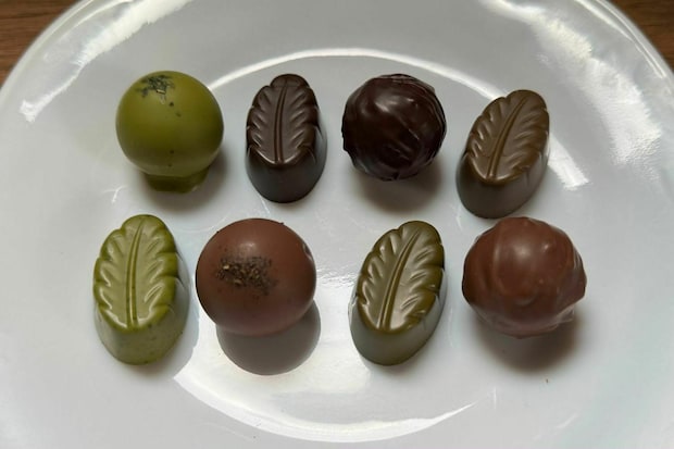 丸型が中にとろけるチョコが入ったトリュフで、葉っぱの形をしたチョコレートはシンプルな型抜きチョコレートです。