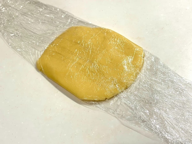 その後、固まった生地をラップに包み、約30分冷蔵庫で寝かせます。