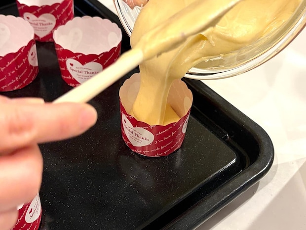 何も難しい工程はなく、あらかじめ用意したマフィンの生地をカップに流し込んでいきます。焼く工程で膨れ上がることを考慮し、生地の量はカップの5~6割程度にしました。