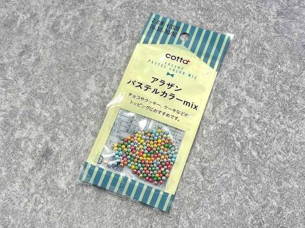 先ほどのバタークッキーミックス粉と同じcottaの商品。小粒の砂糖菓子で、シルバー、ピンク、ブルー、イエロー、グリーンなど色もさまざまで鮮やかですよね♪