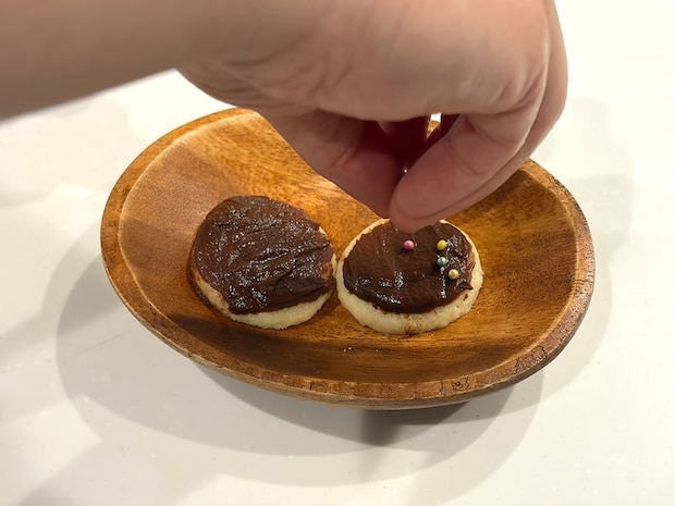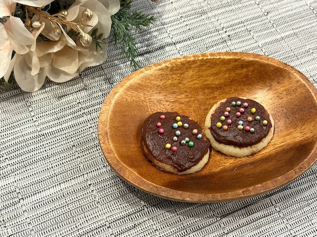 筆者は先ほど作ったクッキーに溶かしたチョコレートを塗り、その上にアラザンをトッピングしてみました。
