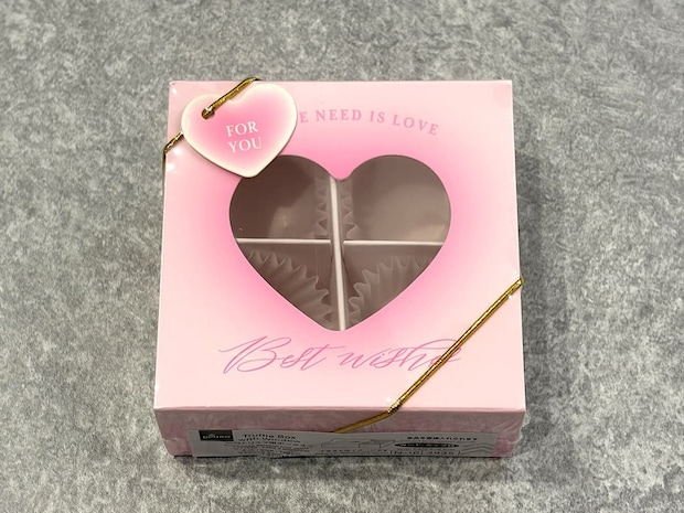 箱にはハート型の窓が付いており、中のトリュフチョコを可愛く見せてくれる役割も♪淡いピンク色にゴールドのゴムバンドというデザイン性も、100均のアイテムとは全く思えない高級感さえあるパッケージです!