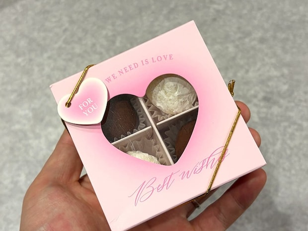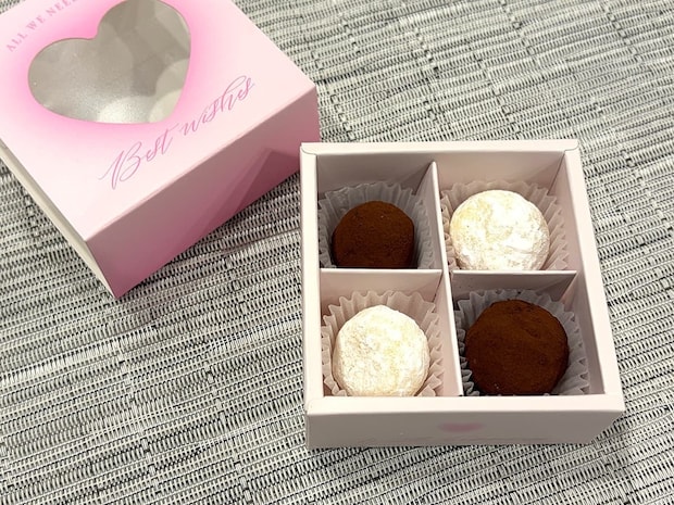 試しに、トリュフチョコとホワイトトリュフチョコを2個ずつ入れてみました。コンパクトなサイズ設計で、本命チョコはもちろん友達から同僚まで使いやすい大きさ!