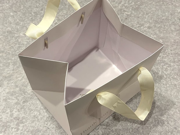 持ち手にはアイボリーのリボンが採用されており、百貨店でギフトを購入したときに入れてもらえそうなデザイン感!実用性と美しさの両方を兼ね備えています♪