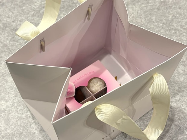 先ほどの窓付トリュフ用ボックスを入れてみましたが、ピンクのパッケージでも全く違和感はありませんね!どのような箱のデザインにもなじむペーパーバッグ、ぜひ試してみてください♪