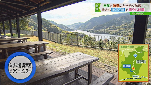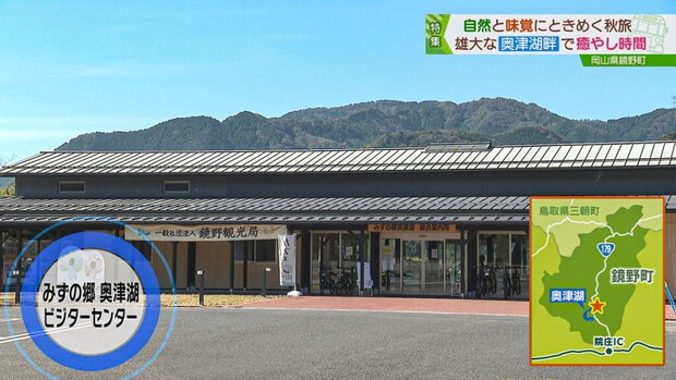 鳥取県との県境・岡山県鏡野町にある奥津湖の景観を楽しめるスポットが「みずの郷奥津湖ビジターセンター」。