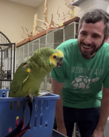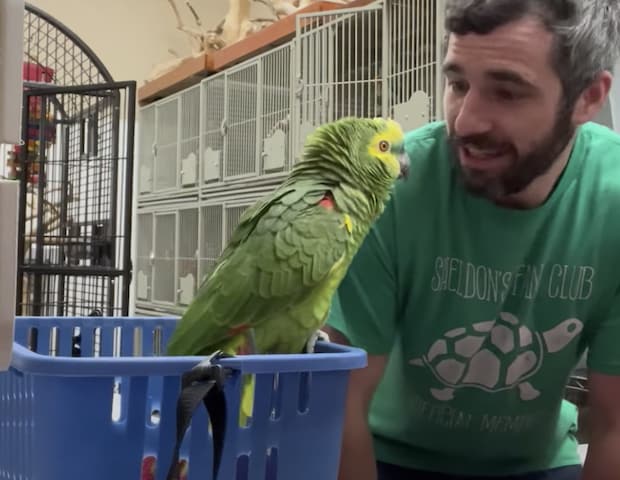 勢いよく男性と会話をするオウムさん
