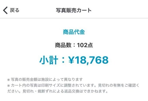 なんと、気付いたときにはカートの中には3桁もの写真が。厳選しているつもりでも、削除ボタンがなかなか押せなくなる、ママあるあるですね。そして迎えるのは…恐怖の金額…。けれど、画面いっぱいに並んだわが子のかわいい写真を見るだけで心癒されて、金額よりも思い出の大切さが勝るのですよね。