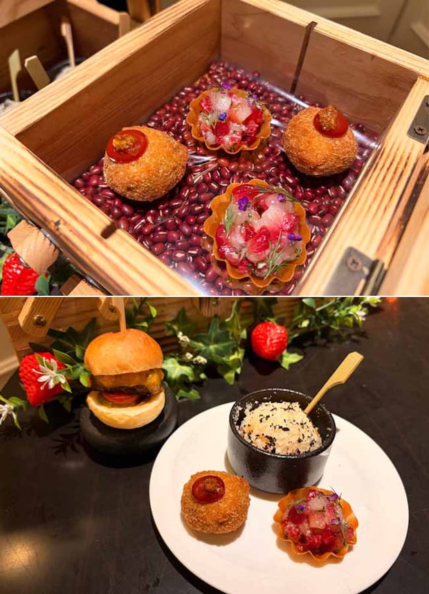 (写真下)左上「シグネチャーバーガースライダー」/小皿左下「牛肉のクロケット」/小皿真ん中「トリュフチーズドーナッツ」/小皿右下「 昆布締めハマチと発酵苺のタルトレット」