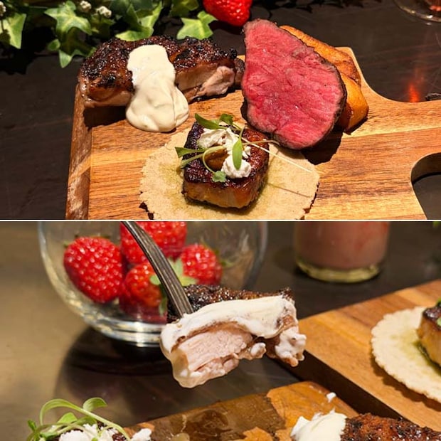 「エンバーグリルサーロイン」は、赤身の旨みがしっかり感じられる一皿。分厚くカットされていながらも驚くほどやわらかく、かぼちゃの種のソースの香ばしさがアクセントに。