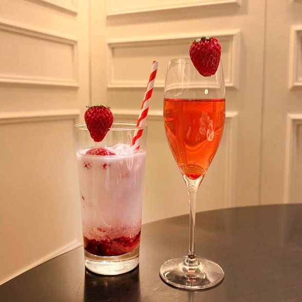 左「シグニチャーいちごミルク」/右「ストロベリーノンアルコールスパークリングワイン」