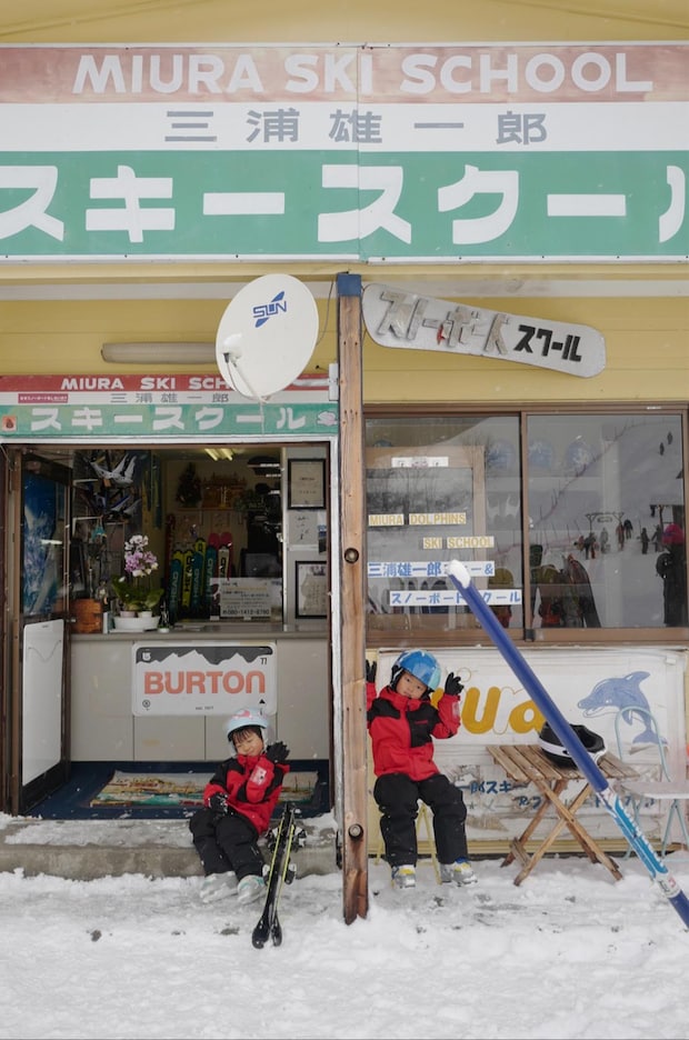 毎年お世話になっているスキースクールの前での記念写真。