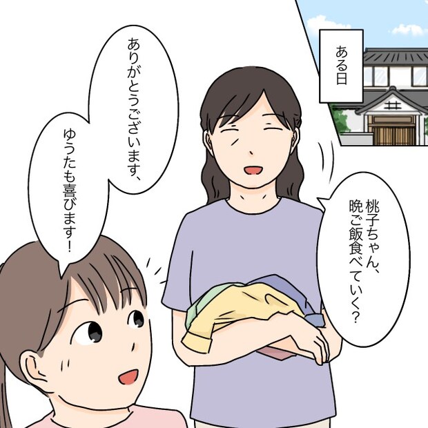 また別の日。義母に「桃子ちゃん、晩ご飯食べていく?」と聞かれた私。自宅に帰ってから作るのは正直面倒だなと思っていたので、「ありがとうございます、ゆうたも喜びます!」とお言葉に甘えてご馳走になることにしました。