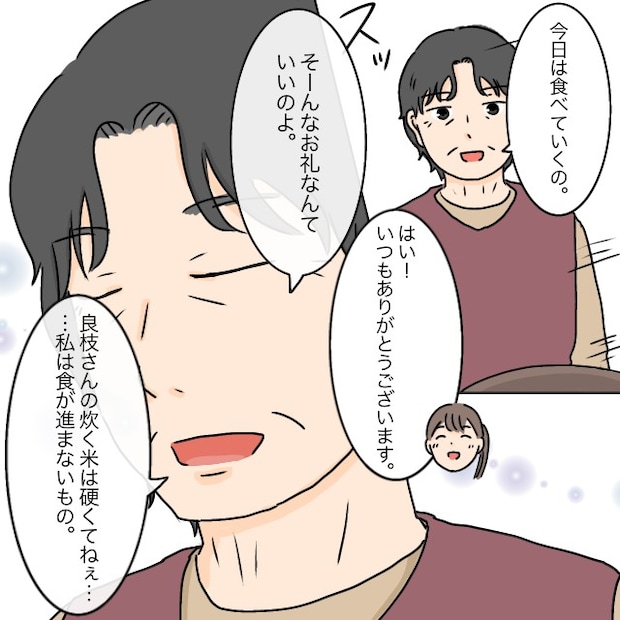 すると、話を聞いていたのか「今日は食べていくの?」と義祖母が登場。心なしか嬉しそうです。「はい!いつもありがとうございます」とお礼を言うと、義祖母は「そーんなお礼なんていいのよ、良枝さんの炊く米は硬くてねぇ・・・私は食が進まないもの」とさりげなく義母への嫌味を投下しました。