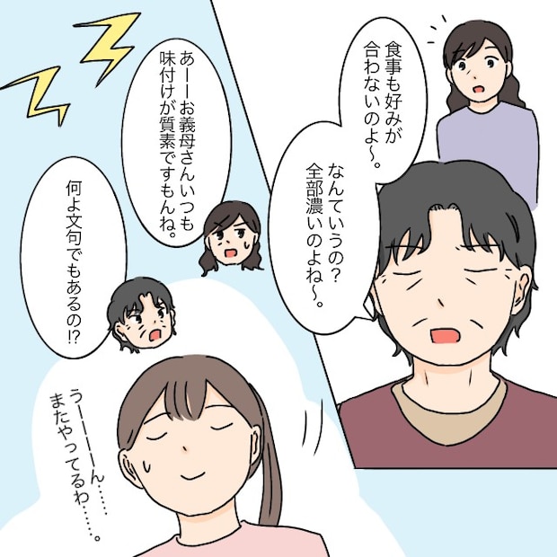 「食事も好みが合わないのよ~、なんていうの?全部濃いのよね」するとそれを聞いていた義母はすかさず応戦。「あー、お義母さんいつも味付けが質素ですもんね」と嫌味に嫌味で返します。「何よ文句でもあるの!?」義祖母のその言葉を合図に、またいつも通り言い争いが始まりました。