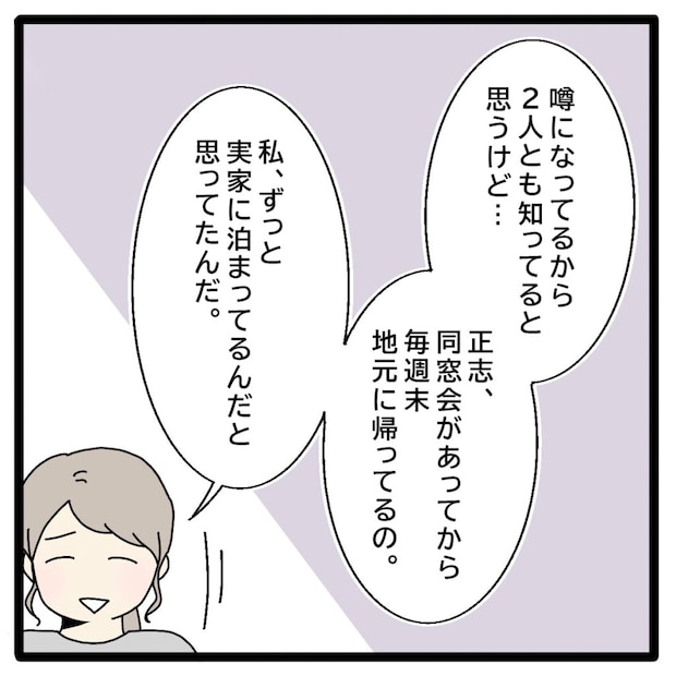 私は声を震わせながら、「噂になってるから2人とも知ってると思うけど、正志、同窓会があってから毎週末地元に帰ってるの・・・ずっと実家に泊まってるんだと思ってたんだ」と2人に言いました。