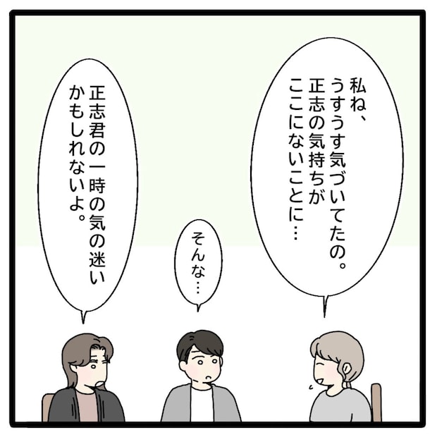 「私ね、うすうす気づいてたの、正志の気持ちがここにないことに」力のない笑顔でそう打ち明ける私に、美沙ちゃんと裕二さんは「正志くんの一時の気の迷いかもしれないよ」と、そっとなぐさめるように声をかけてくれました。