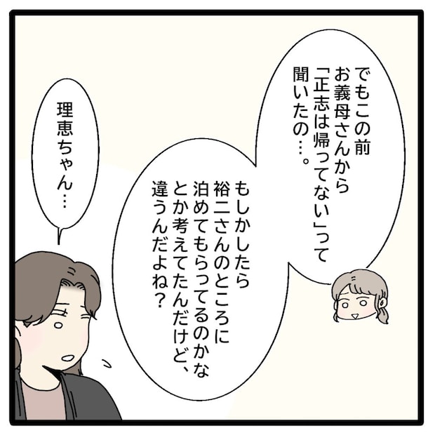 「でもこの前、お義母さんから『正志は帰ってない』って聞いたの・・・もしかしたら裕二さんのところに泊めてもらってるのかなとか考えてたんだけど、違うんだよね?」私がそう問いかけると、美沙ちゃんは苦しそうな表情で私の名前を呼びました。