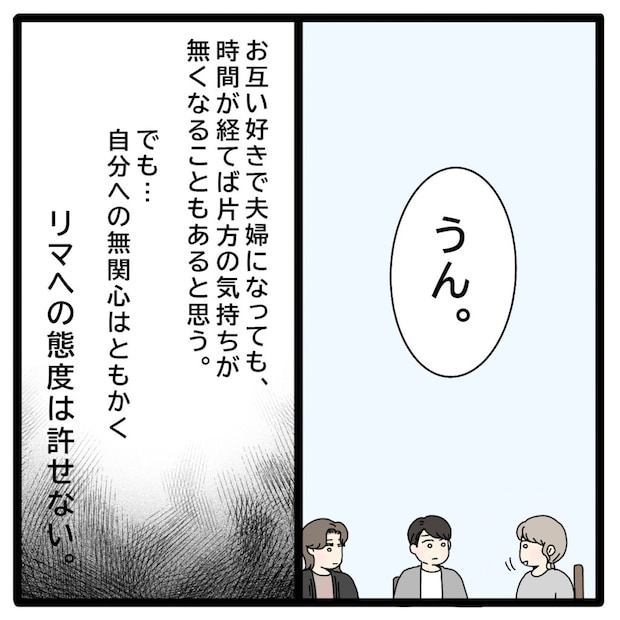 美沙ちゃんの問いかけに、私は力強く「うん」と応えました。お互い好きで夫婦になっても、時間が経てば片方の気持ちが無くなることもあると思います。でも、私への無関心はともかく、リマへの態度は許せません。私は、正志の返答次第では別れることも視野に入れて、話し合うことに決めました。