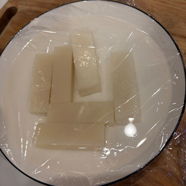 ②ボールにお水とお餅(水はお餅が浸るくらい)を入れ、ラップをして600wで2分チンする(竹串で刺して通ればok)