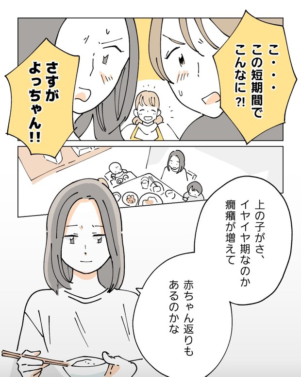 「こ、この短時間でこんなに!?」よっちゃんは、この短い時間で何品かの料理を作ってくれていたのです。しかも、温めるだけですぐに食べられる作り置きメニューばかり。さすがよっちゃんです。お腹がペコペコだった私たちはすぐに机に座り、料理を食べ始めました。すると食事の最中、ナオがぽつりとつぶやきました。「上の子がさ、イヤイヤ期なのか癇癪が増えて、赤ちゃん返りもあるのかな」