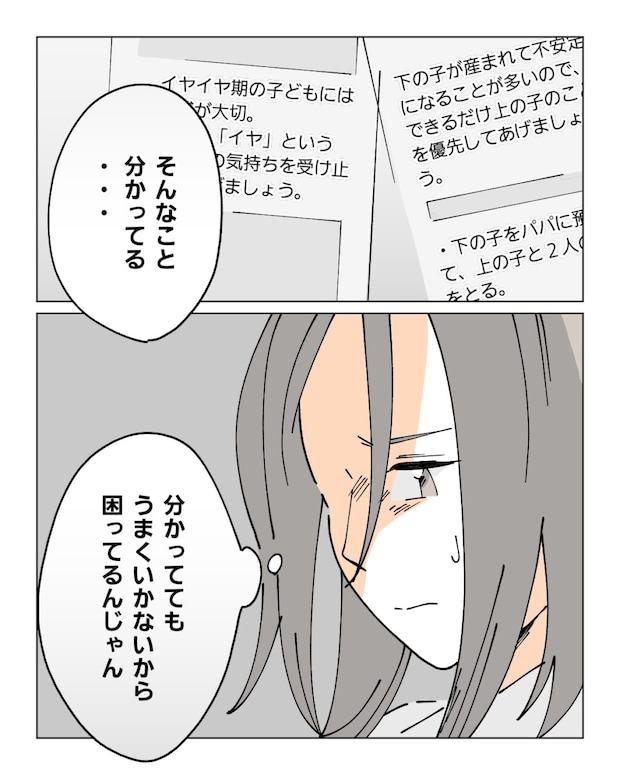 専門家のアドバイスも「上の子を優先しましょう」とか「イヤという気持ちを受け止めましょう」とか・・・そんなこと分かってるよって思ってしまって。検索で書かれているアドバイスが全部キレイごとばかりに思えてしまう。分かっててもうまくいかなくて困ってる場合の対処法を教えて欲しいのに、いくら調べても答えにたどり着かなくて苦しい。そう話すナオは、相当追い詰められているように見えました。